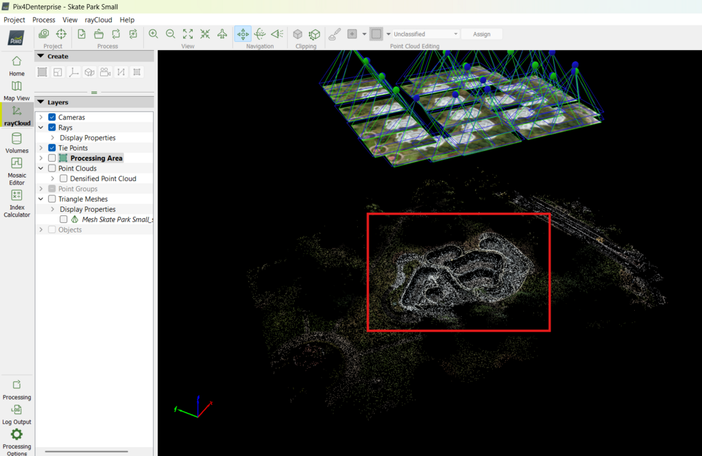 Using the Pix4D software, I begin by importing all collected aerial images and running them through the initial processing step. This stage aligns and stitches the photos together based on their estimated geolocation data recorded by the drone. The result is a sparse point cloud and an initial framework for further 3D reconstruction.
