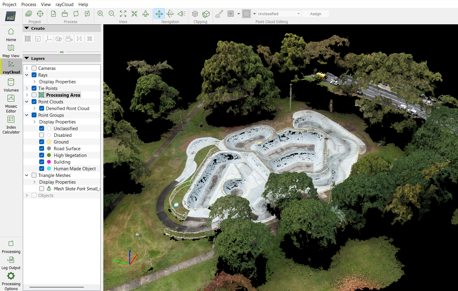 The next stage involves generating a densified point cloud using the tools provided in Pix4D. This process uses the results from initial processing to create a much denser and more detailed set of points that define the surface of the mapped area. (Specific results for this example can be found in the Quality Report at the end of this page.)