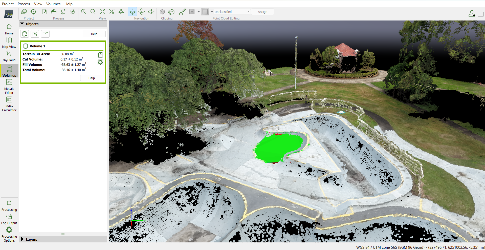 Using Using PIX4D Volume algorithms, accurate estimations of volume can be performed for complex areas